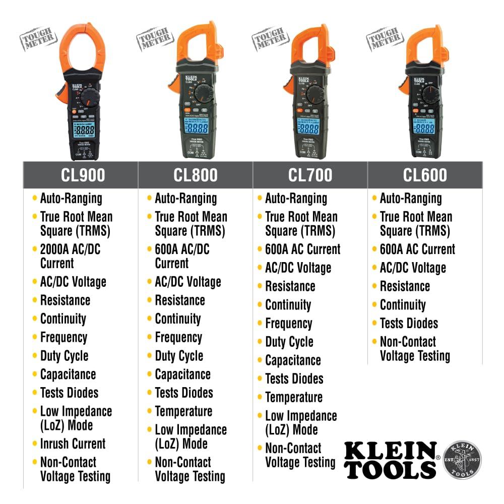 The CL220 measures AC current and NCVT via clamp and AC/DC voltage, resistance, and continuity via test-leads, and temperature with thermocouple. The meter features automatically ranging True Root Mean Squared (TRMS) measurement technology for accuracy. Additionally, a backlit LCD makes viewing in low light easy. For more than 160 years, Klein Tools has manufactured premium-quality, professional-grade hand tools that deliver the performance, durability and precision needed to get the job done right. Our family of engineers, workers and craftsman continue to put six generations of expertise into every tool we create by using only the highest quality materials, superior workmanship, and keeping manufacturing as close to home as we can. Klein isn't just the name of our company, it's also our family name. And since we're an American company that's family-owned and family-run, you know you can count on us to be here tomorrow. Klein Tools doesn't just make great products, we make great products that stand up to the demands of the professionals who use them every day … Since 1857.