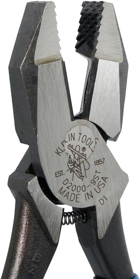 Klein D2000-9ST 9-Inch Ironworker's Work Pliers-High-Leverage. The Klein D2000-9ST 9-Inch Ironworker's Work Pliers-High-Leverage twists and cuts soft annealed rebar tie wire. The Klein D2000-9ST 9-Inch Ironworker's Work Pliers-High-Leverage features the high-leverage design where the rivet is closer to the cutting edge for 46-Percent greater cutting and gripping power than other pliers designs. The Klein D2000-9ST 9-Inch Ironworker's Work Pliers-High-Leverage has a hook bend handle. The Klein D2000-9ST 9-Inch Ironworker's Work Pliers-High-Leverage also has spring-loaded action for self-opening. The Klein D2000-9ST 9-Inch Ironworker's Work Pliers-High-Leverage has heavy-duty knurled jaws. The Klein D2000-9ST 9-Inch Ironworker's Work Pliers-High-Leverage is the 2000 Series with heavy-duty cutting knives which cut ACSR, screws, nails and most hardened wire. The Klein D2000-9ST 9-Inch Ironworker's Work Pliers-High-Leverage features combination polished and black-oxide finish.