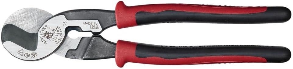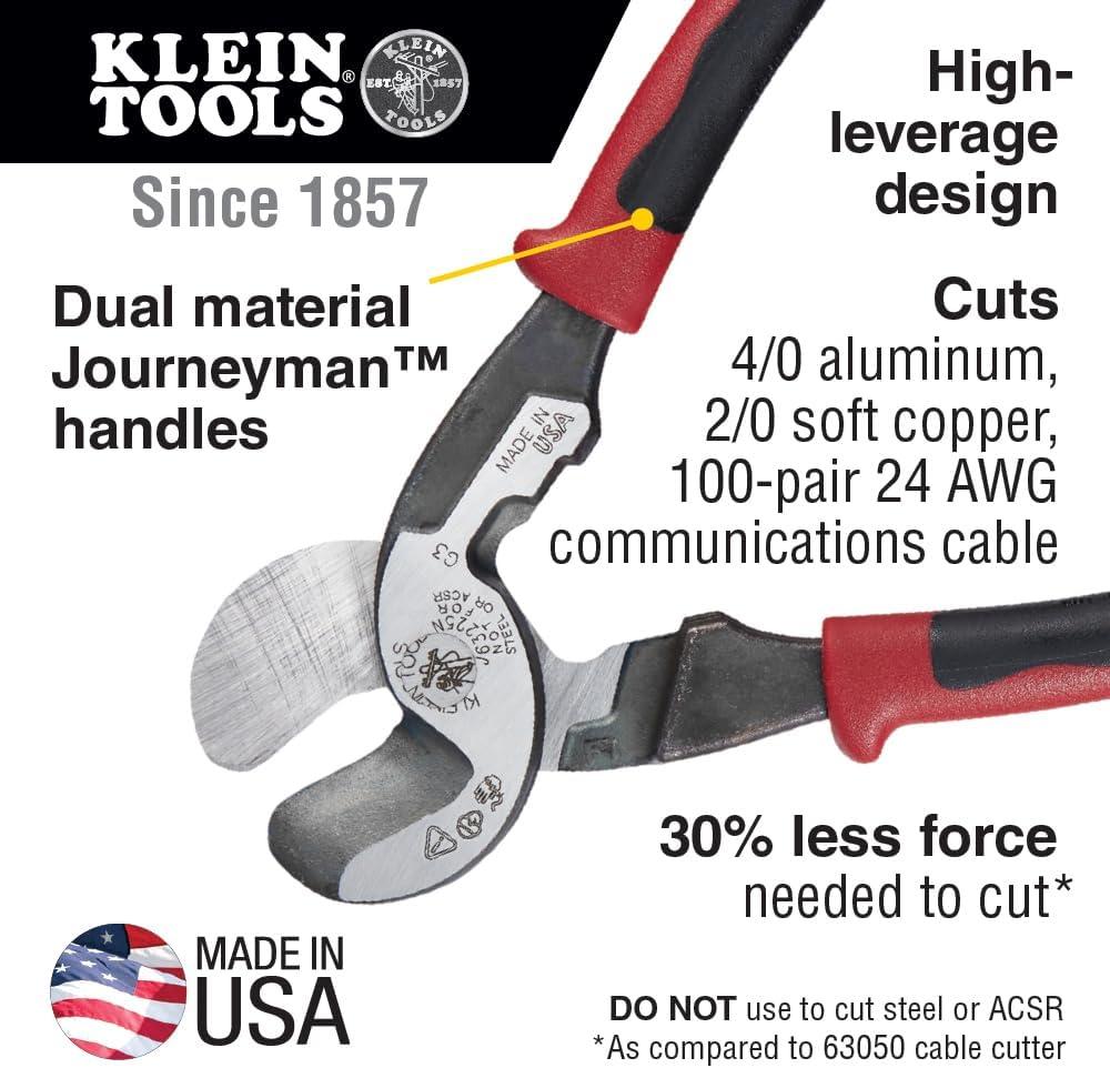 Klein Tools J63225N Cable Cutter, Made in USA, Journeyman High-Leverage Wire Cutter and Stripper for Cutting Aluminum, Soft Copper and Communications Cable(Standard Cutter)
