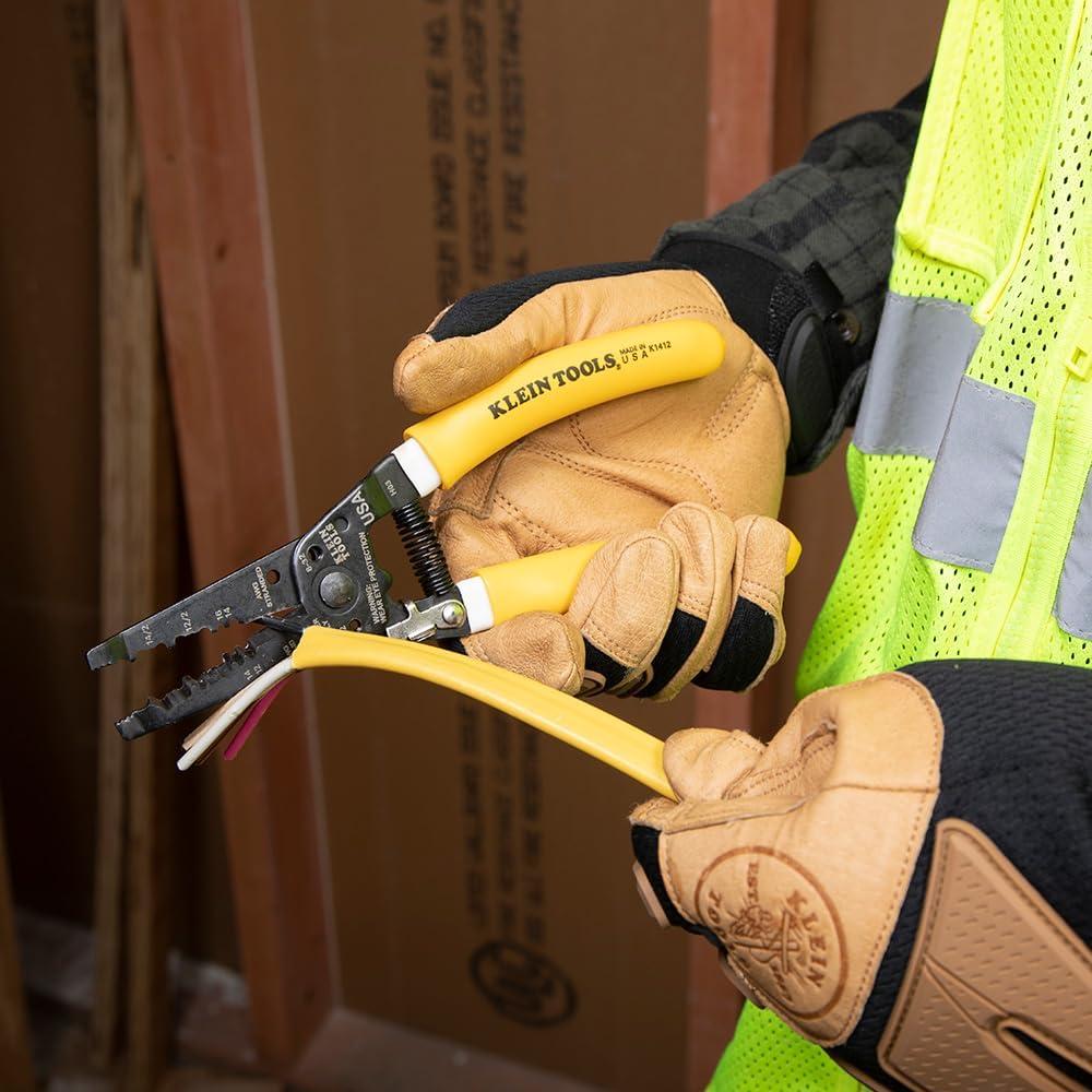 The Klein-Kurve Dual NM Cable Stripper/Cutter allows you to cleanly remove the outer jacket of 12/2 and 14/2 Type NM-B non-metallic sheathed cable. Stripping holes easily remove the insulation on 12 and 14 AWG solid wire. Precision shear-type blades provide square clean cuts on solid copper wire. Curved handles with double-dipped grips makes this stripper/cutter comfortable to use every day. For more than 160 years, Klein Tools has manufactured premium-quality, professional-grade hand tools that deliver the performance, durability and precision needed to get the job done right. Our family of engineers, workers and craftsman continue to put six generations of expertise into every tool we create by using only the highest quality materials, superior workmanship, and keeping manufacturing as close to home as we can. Klein isn't just the name of our company, it's also our family name. And since we're an American company that's family-owned and family-run, you know you can count on us to be here tomorrow. Klein Tools doesn't just make great products, we make great products that stand up to the demands of the professionals who use them every day … Since 1857.