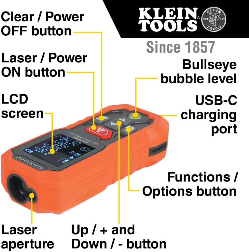 Klein Tool's Laser Distance Measure is a rechargeable laser distance measure that provides fast and accurate measurements up to 200 feet. It features real time measuring, adding and subtracting measurements, square footage, rectangular perimeter calculations, volume, and indirect measurement calculations to help speed up the measuring and estimating work of professionals. The rechargeable battery is powered via a USB-C port and is convenient to recharge anywhere on or off the job. Durability is ensured by the protective hard case, its IP54 dust and water rating, and a 6.6-Foot (2 m) drop rating. The bright, backlit screen is easy to see outside and inside and makes measuring on early job sites easier. The green laser is up to 2 times easier to see than red lasers in different lighting conditions.