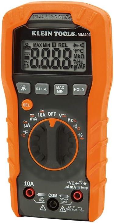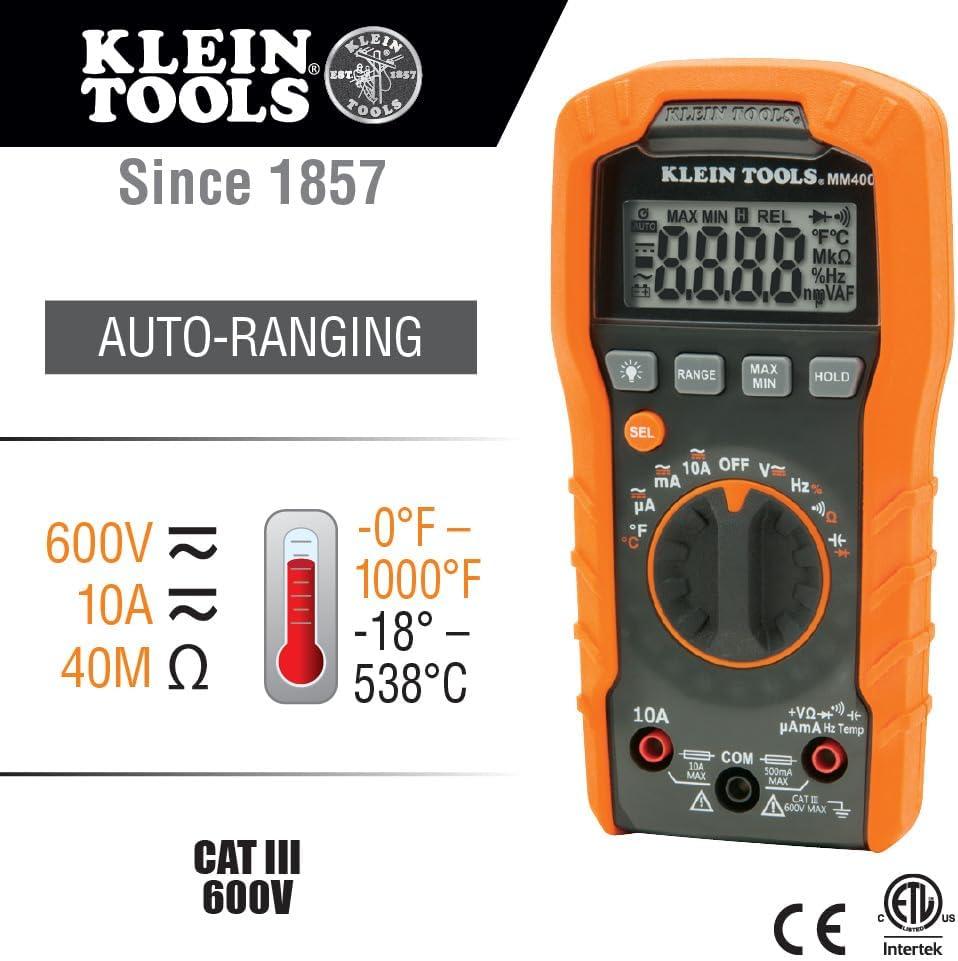 Klein Tools MM400 Multimeter is an auto-ranging multimeter that measures AC/DC voltage, AC/DC current, and resistance. It can also measure temperature, capacitance, frequency, duty-cycle, and test diodes and continuity. Klein Tools Test and Measurement product line was exclusively designed from the ground up by electricians for electricians. Years of field research, combined with extensive input from electricians across America, inspired the development of meters and electrical testers loaded with innovative, time-saving features. For more than 160 years, Klein Tools has manufactured premium-quality, professional-grade hand tools that deliver the performance, durability and precision needed to get the job done right. Our family of engineers, workers and craftsman continue to put six generations of expertise into every tool we create by using only the highest quality materials, superior workmanship, and keeping manufacturing as close to home as we can. Klein isn't just the name of our company, it's also our family name. And since we're an American company that's family-owned and family-run, you know you can count on us to be here tomorrow. Klein Tools doesn't just make great products, we make great products that stand up to the demands of the professionals who use them every day … Since 1857.
