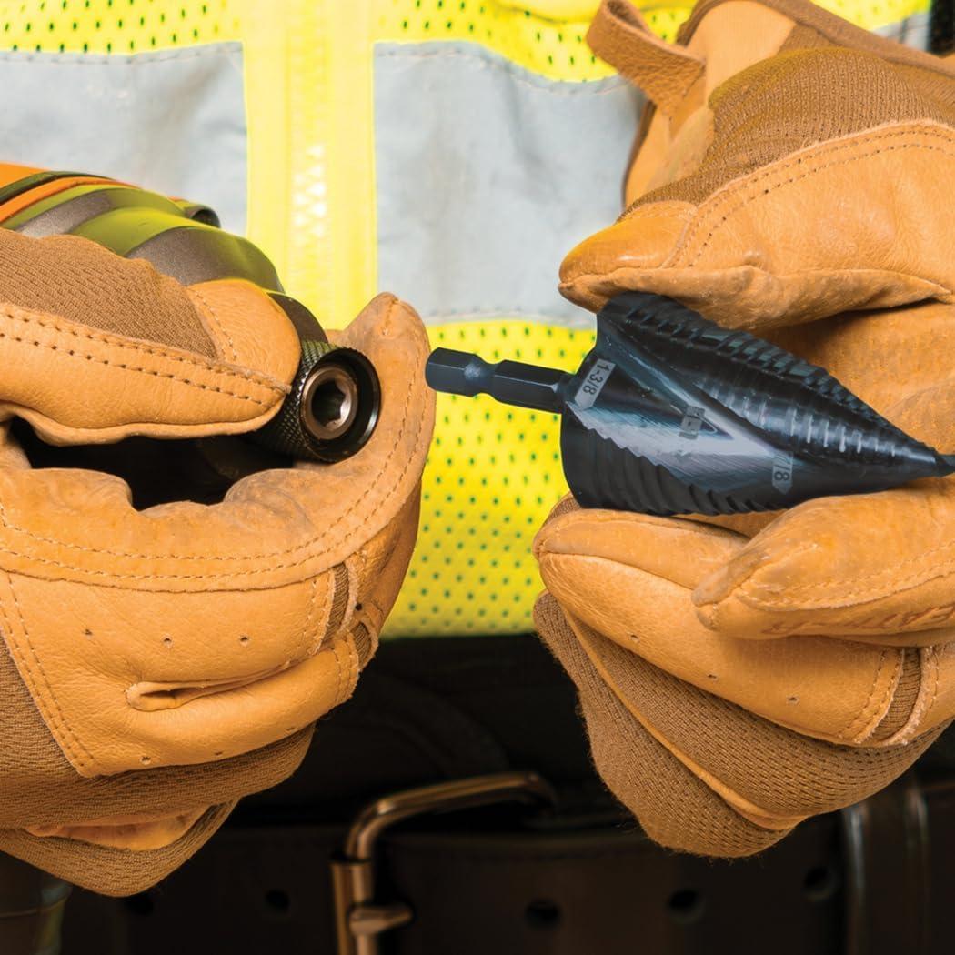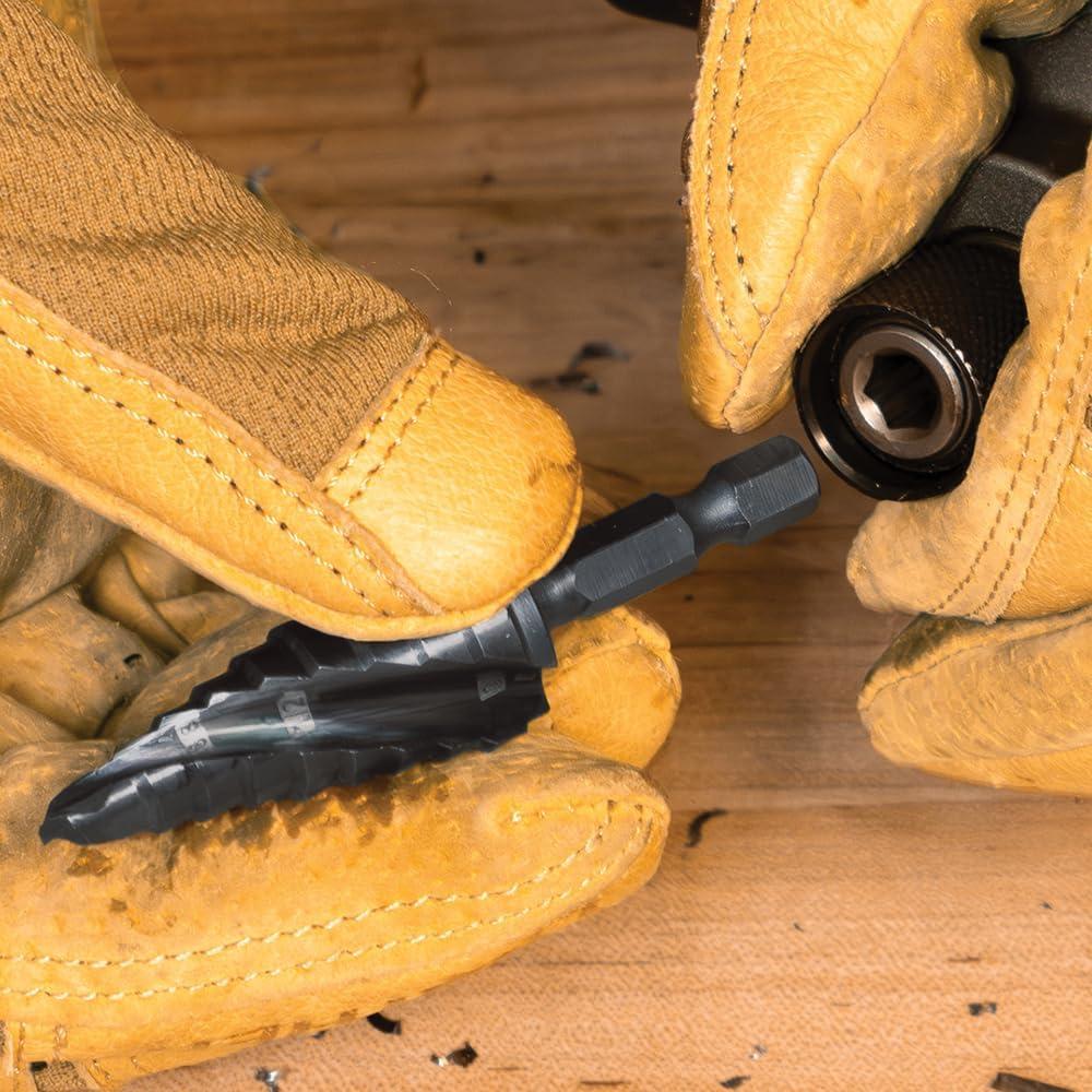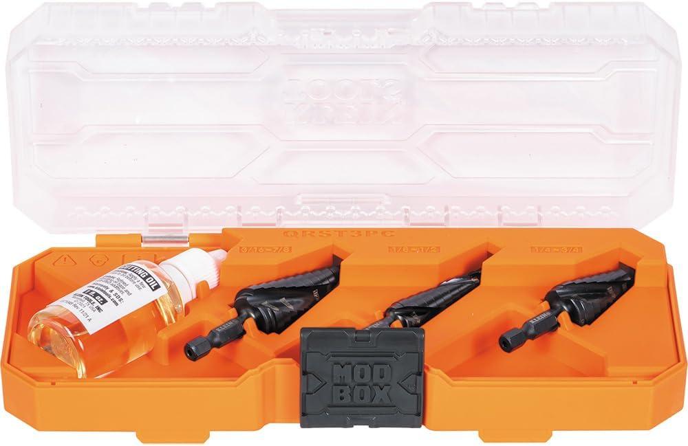 The Premium Electrician's Quick Release Step Bit Kit contains 3 step bits sized 7/8-Inch, 1-1/8-Inch, and 1-3/8-Inch for creating hole cutouts in panels and j-boxes to accommodate most commonly used 1/2-Inch, 3/4-Inch, and 1-Inch conduit. Dual Spiral Flutes help pull the step bit through the material for faster cutting. The aluminum titanium nitride coating is 10 times more durable than steamed black oxide for longer bit life. Impact rated, the 1/4-Inch hex shank provides a firm, positive grip and allows quick and convenient usage with an impact driver and a drill. The compact, modular case comes with cutting oil and is designed to nest neatly within MODbox toolboxes and on the MODbox Case Adapter Side Rail Attachment.