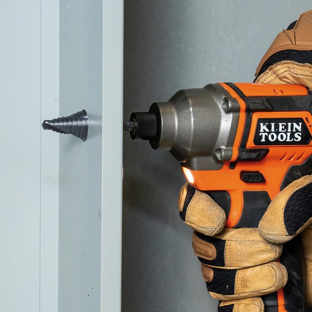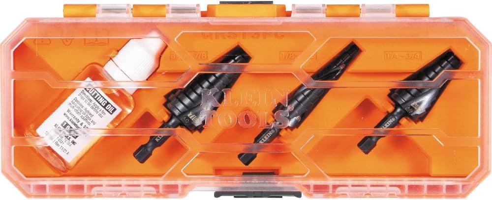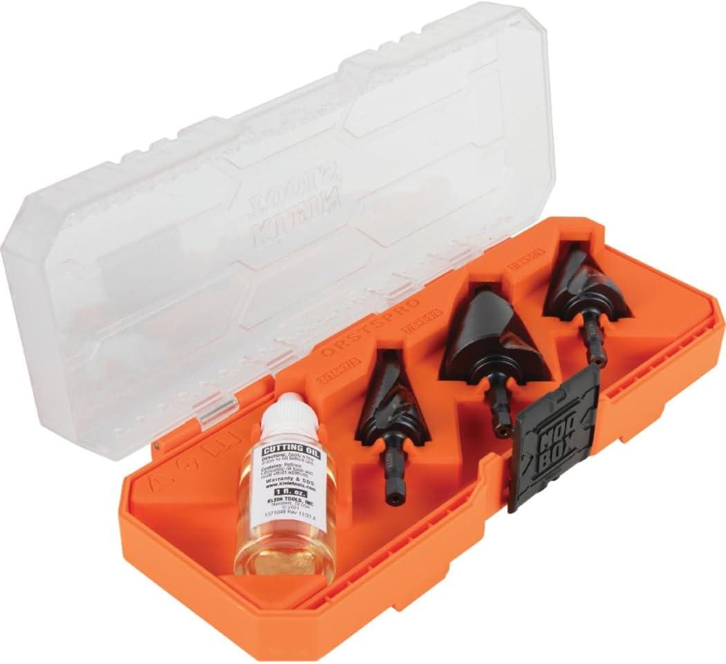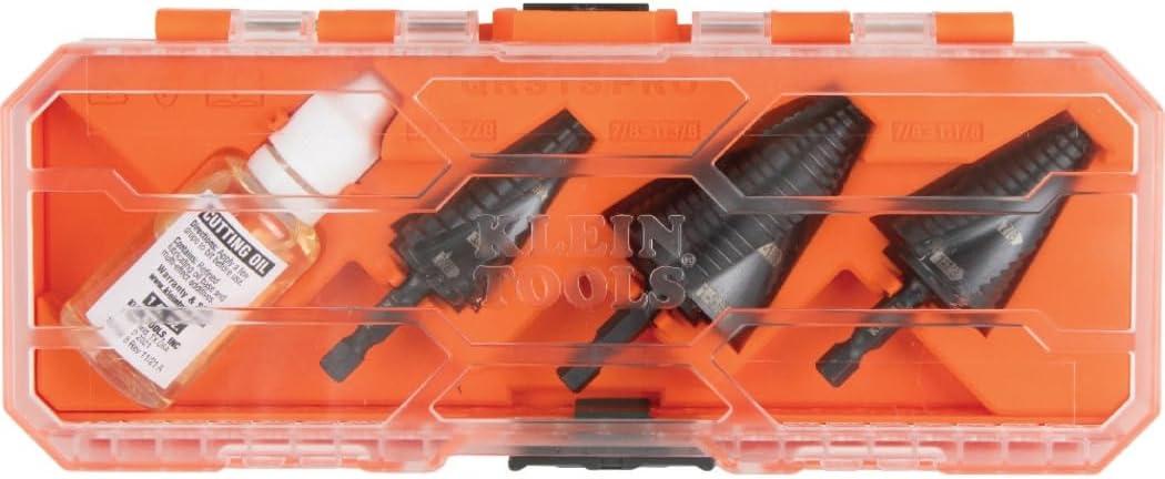 Klein Tools QRSTSPRO Premium 3-Piece Electrician’s Step Bit Set with Cutting Oil, Modular Case, Impact Rated Quick Release, Double Spiral Flutes(Quick Release)