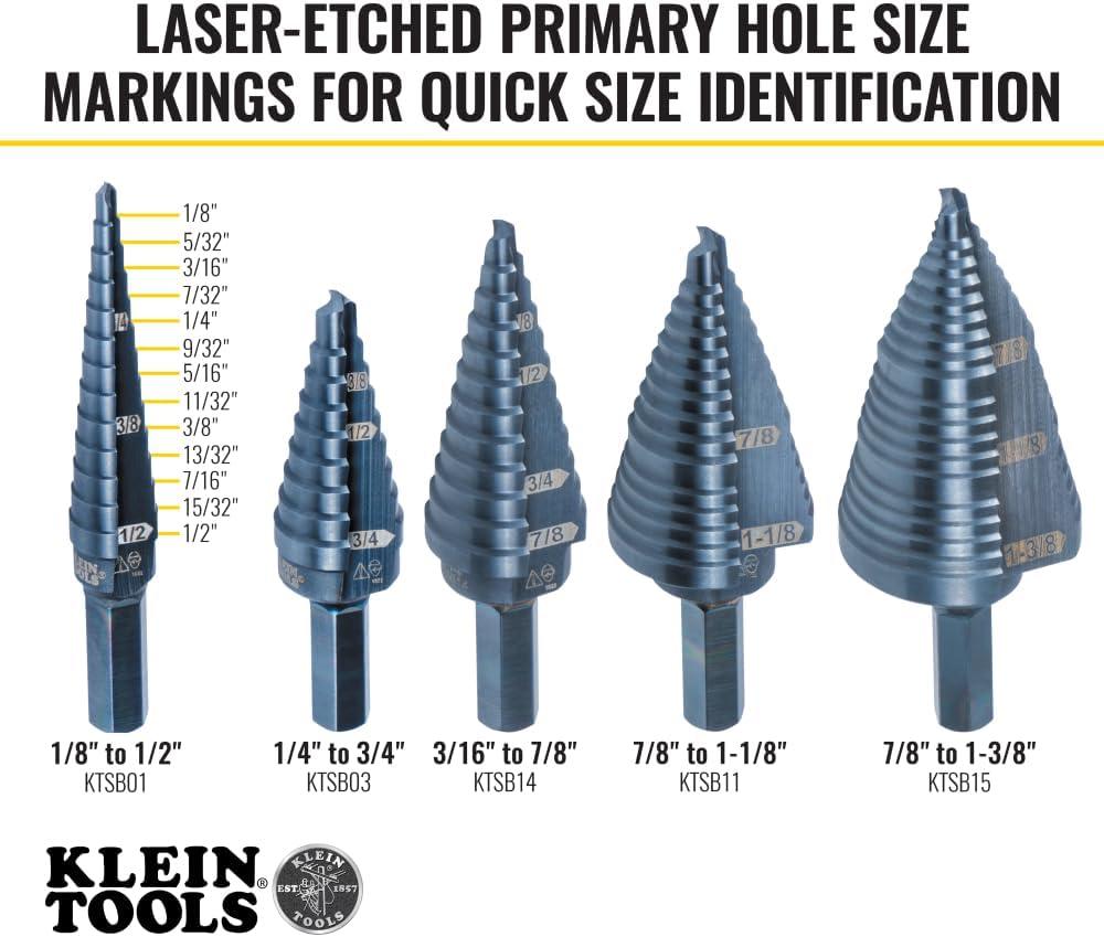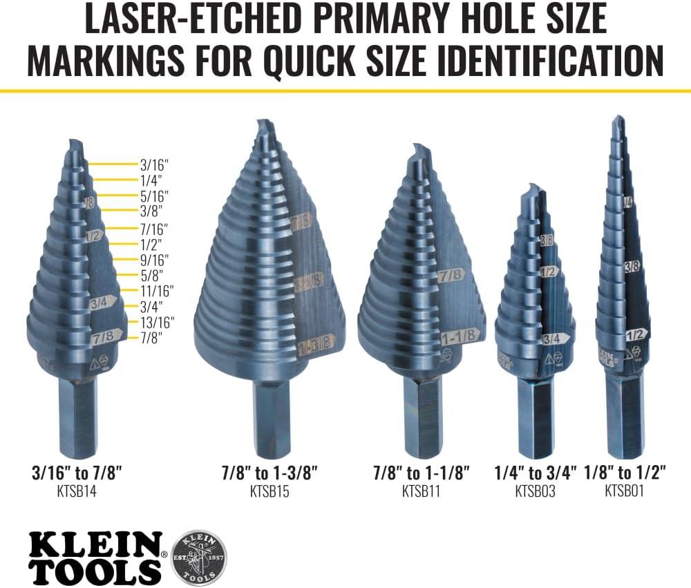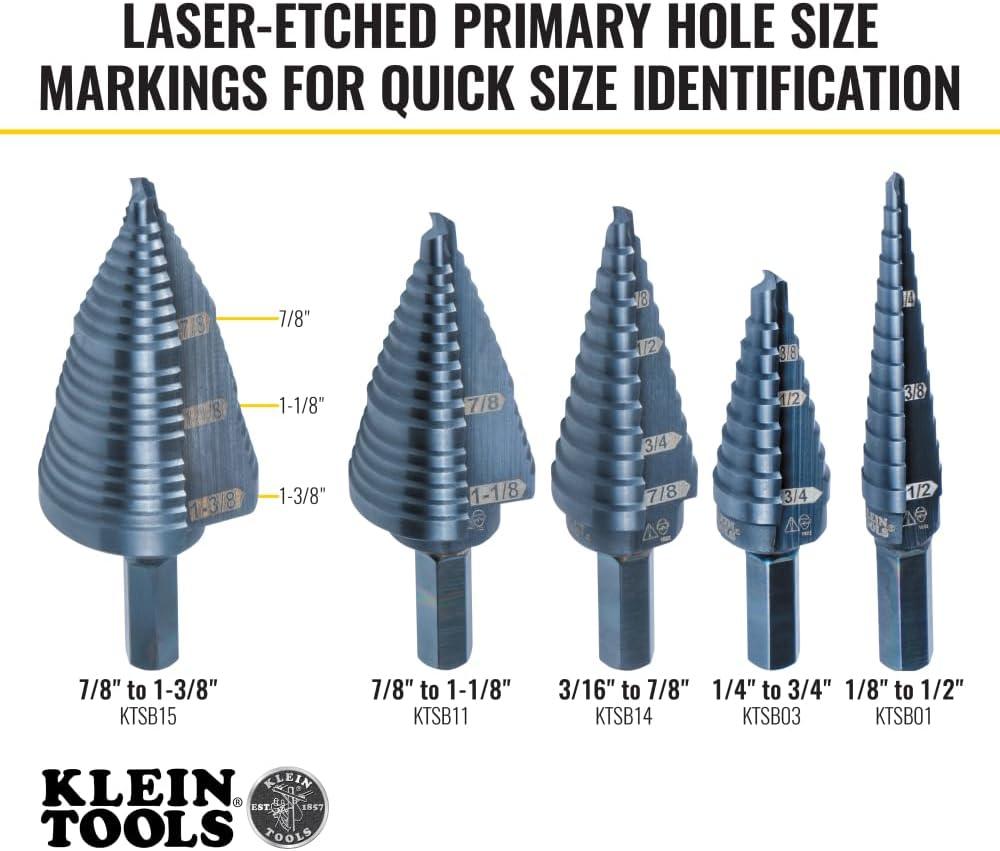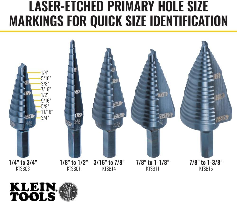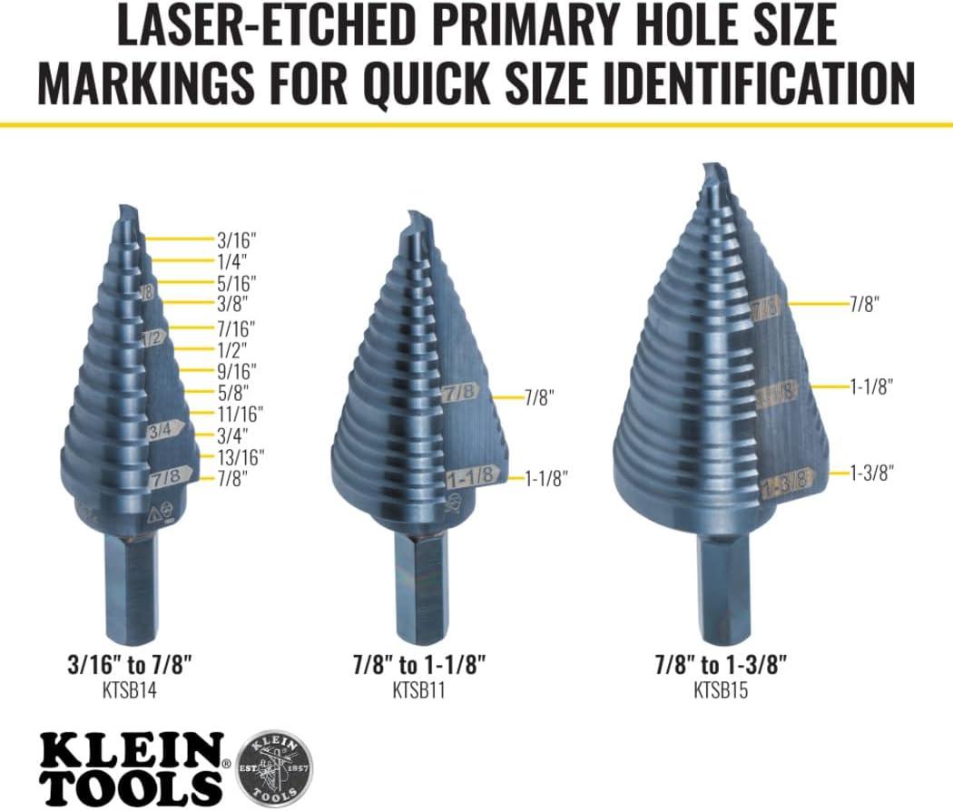 SET CONTAINS 3 STEP BITS: 7/8-Inch, 1-1/8-Inch, and 1-3/8-Inch sizes for creating hole cutouts in panels and j-boxes to accommodate most commonly used 1/2-Inch, 3/4-Inch, and 1-Inch conduit