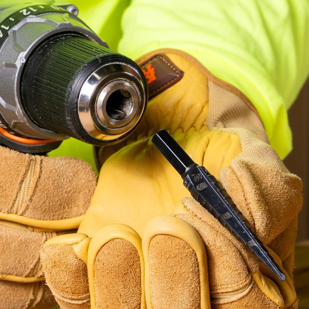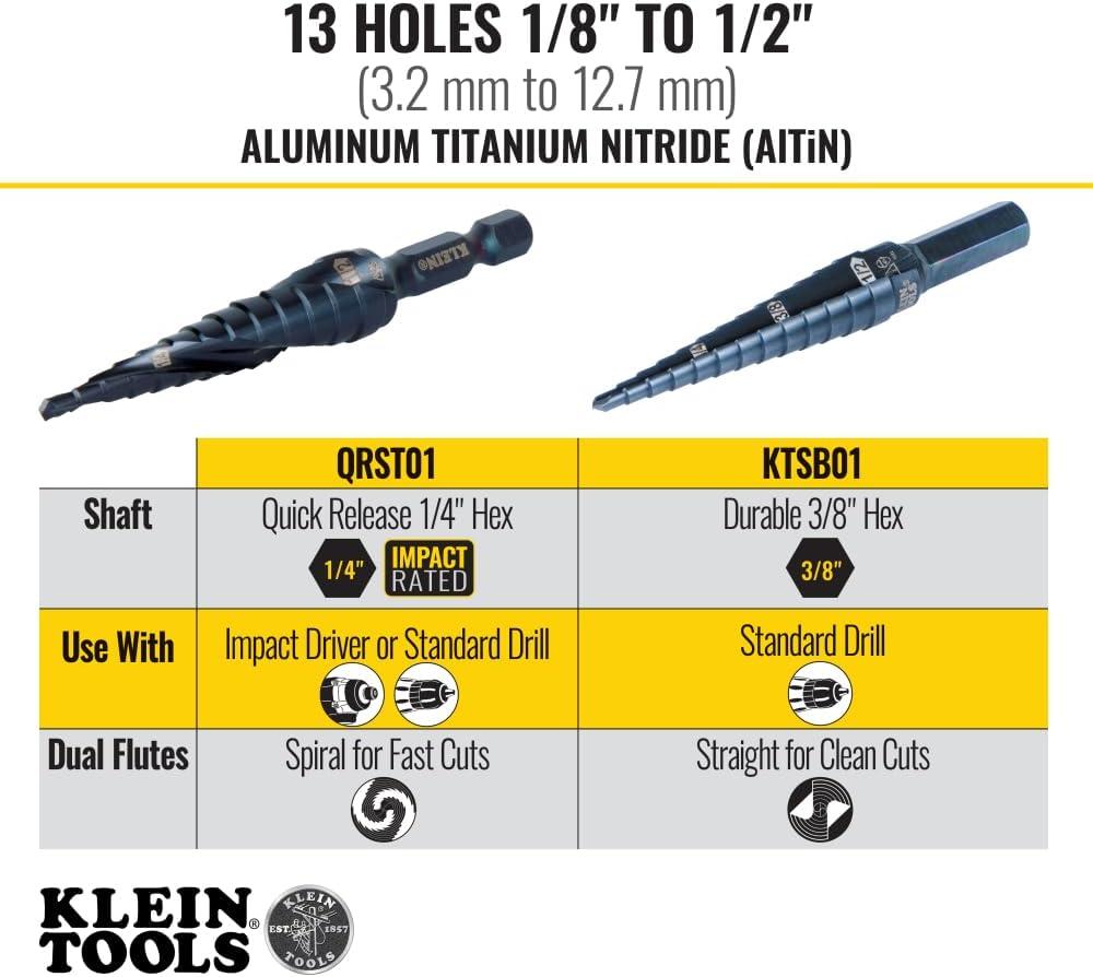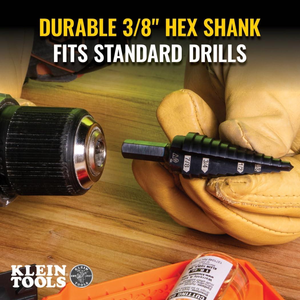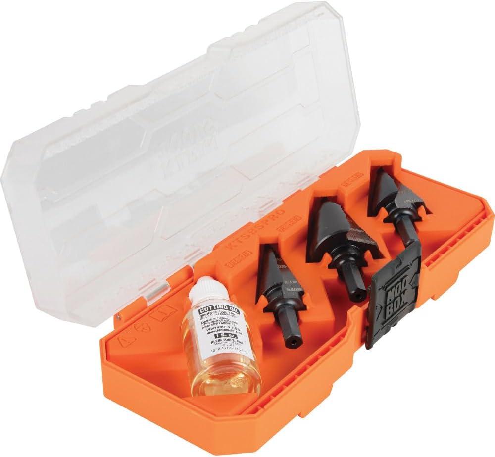 The Premium Electrician's Quick Release Step Bit Kit contains 3 step bits sized 7/8-Inch, 1-1/8-Inch, and 1-3/8-Inch for creating hole cutouts in panels and j-boxes to accommodate most commonly used 1/2-Inch, 3/4-Inch, and 1-Inch conduit. Dual Spiral Flutes help pull the step bit through the material for faster cutting. The aluminum titanium nitride coating is 10 times more durable than steamed black oxide for longer bit life. Impact rated, the 1/4-Inch hex shank provides a firm, positive grip and allows quick and convenient usage with an impact driver and a drill. The compact, modular case comes with cutting oil and is designed to nest neatly within MODbox toolboxes and on the MODbox Case Adapter Side Rail Attachment.