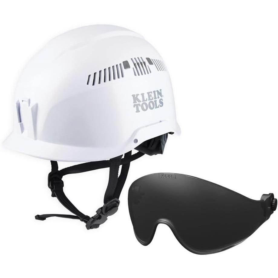 Klein Tools Safety Helmet, Vented Class C Safety Hard Hat, Removable Chin Strap, Adjustable Vents(White Hardhat with Clear Visor)