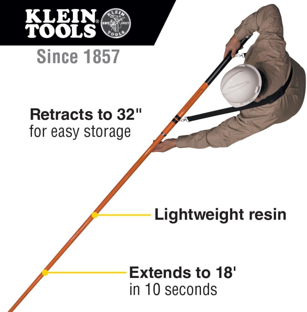 When speed counts, look no further. This tool extends to 18 feet in 10 seconds! Easily retrieve cable from a distance without needing an extra pair of hands to shorten installation time. Great for low voltage applications. For more than 160 years, Klein Tools has manufactured premium-quality, professional-grade hand tools that deliver the performance, durability and precision needed to get the job done right. Our family of engineers, workers and craftsman continue to put six generations of expertise into every tool we create by using only the highest quality materials, superior workmanship, and keeping manufacturing as close to home as we can. Klein isn't just the name of our company, it's also our family name. And since we're an American company that's family-owned and family-run, you know you can count on us to be here tomorrow. Klein Tools doesn't just make great products, we make great products that stand up to the demands of the professionals who use them every day … Since 1857.