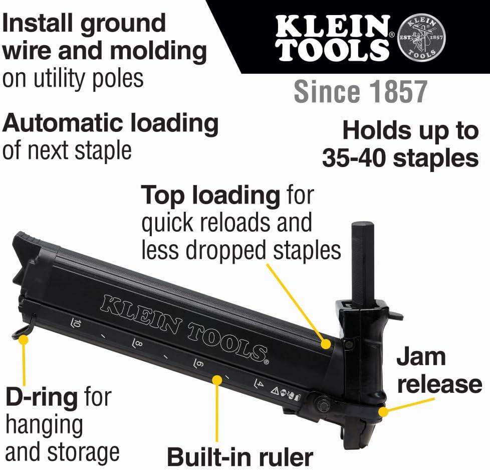 Klein's Utility Staple Starter is designed to hold and dispense utility staples to install ground wire and ground molding to utility poles. No more dropping staples, hitting fingers or puncturing work gloves. The stapler can accommodate 35 to 40 staples to finish installation on one pole. It automatically loads the next staple for smoother operation. Works with both Klein heavy duty staples as well as other utility staples on the market. One tool, one set of staples. For more than 160 years, Klein Tools has manufactured premium-quality, professional-grade hand tools that deliver the performance, durability and precision needed to get the job done right. Our family of engineers, workers and craftsman continue to put six generations of expertise into every tool we create by using only the highest quality materials, superior workmanship, and keeping manufacturing as close to home as we can. Klein isn't just the name of our company, it's also our family name. And since we're an American company that's family-owned and family-run, you know you can count on us to be here tomorrow. Klein Tools doesn't just make great products, we make great products that stand up to the demands of the professionals who use them every day … Since 1857.