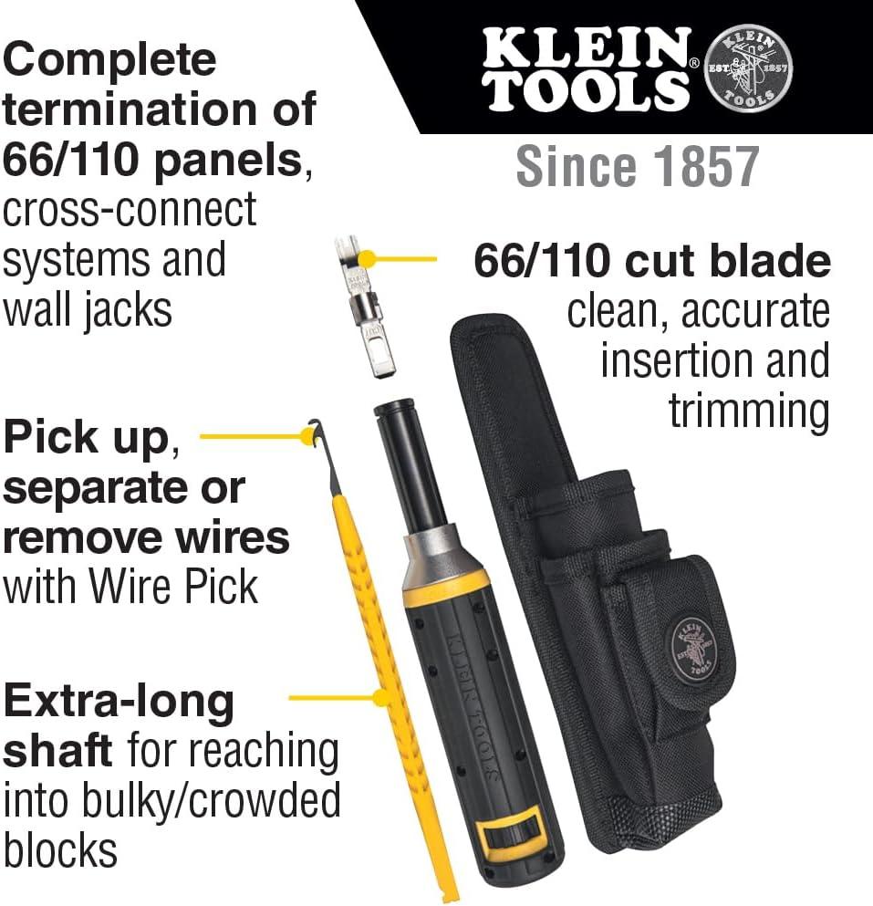 The Cushion-Grip Impact Tool Kit provides everything required to install and maintain 110 and 66 panels, cross-connect systems and wall jacks with secure terminations. Utilizing an optimized two-step impact process, the punchdown tool precisely inserts and then trims off excess wire. The 4-Piece kit comes with punchdown tool, wire pick, blade and pouch. For more than 160 years, Klein Tools has manufactured premium-quality, professional-grade hand tools that deliver the performance, durability and precision needed to get the job done right. Our family of engineers, workers and craftsman continue to put six generations of expertise into every tool we create by using only the highest quality materials, superior workmanship, and keeping manufacturing as close to home as we can. Klein isn't just the name of our company, it's also our family name. And since we're an American company that's family-owned and family-run, you know you can count on us to be here tomorrow. Klein Tools doesn't just make great products, we make great products that stand up to the demands of the professionals who use them every day … Since 1857.