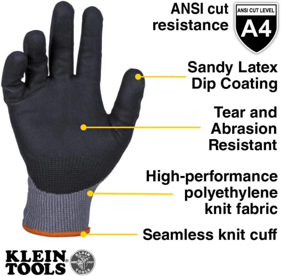 Klein Tools Winter Work Gloves, Knit Dipped ANSI A4 Cut-Resistant, Sandy Latex Coated, Fleece-Lined, Touchscreen Capable(Large)